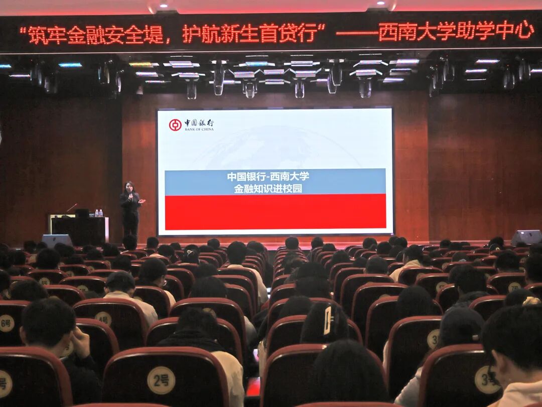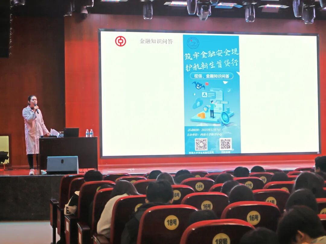为助力首次申办助学贷款的新生提升金融安全意识,增强防诈能力,11月7日,西南大学助学中心携手北碚区反诈骗中心、中国银行,于南区第二学生活动中心举办以“筑牢金融安全堤,护航新生首贷行”为主题的宣讲活动。活动邀请到北碚区反诈骗中心警官李晶和中国银行工作人员万欣作为主讲嘉宾,为新生们呈上了一场内容丰富、极具实用价值的金融安全知识专题讲座。