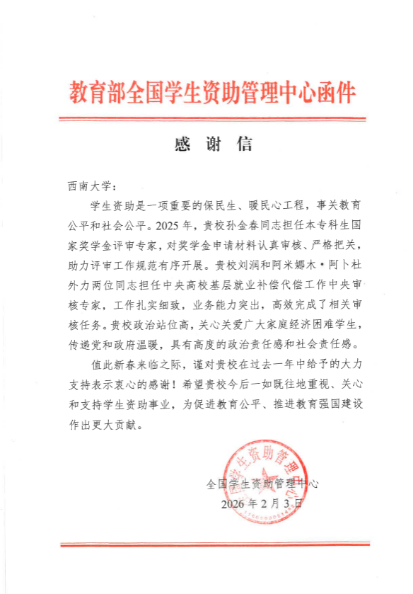 此外,2025 年学校先后派出三位同志参与本专科生国家奖学金评审、基层就业补偿代偿审核等工作,高效完成了相关审核任务。教育部全国学生资助管理中心对学校在过去一年中给予的支持表示感谢,希望学校继续支持学生资助事业,为促进教育公平、推进教育强国建设作出更大贡献!