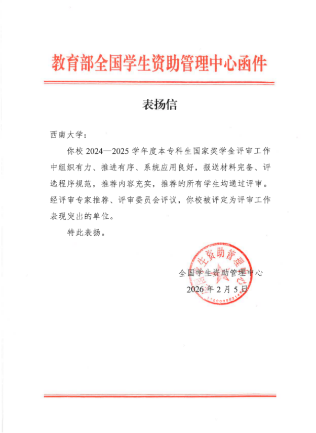 《表扬信》指出,西南大学在国家奖学金评审中组织有力、推进有序、系统应用良好,报送材料完备、评选程序规范,推荐内容充实,推荐的所有学生均通过评审。