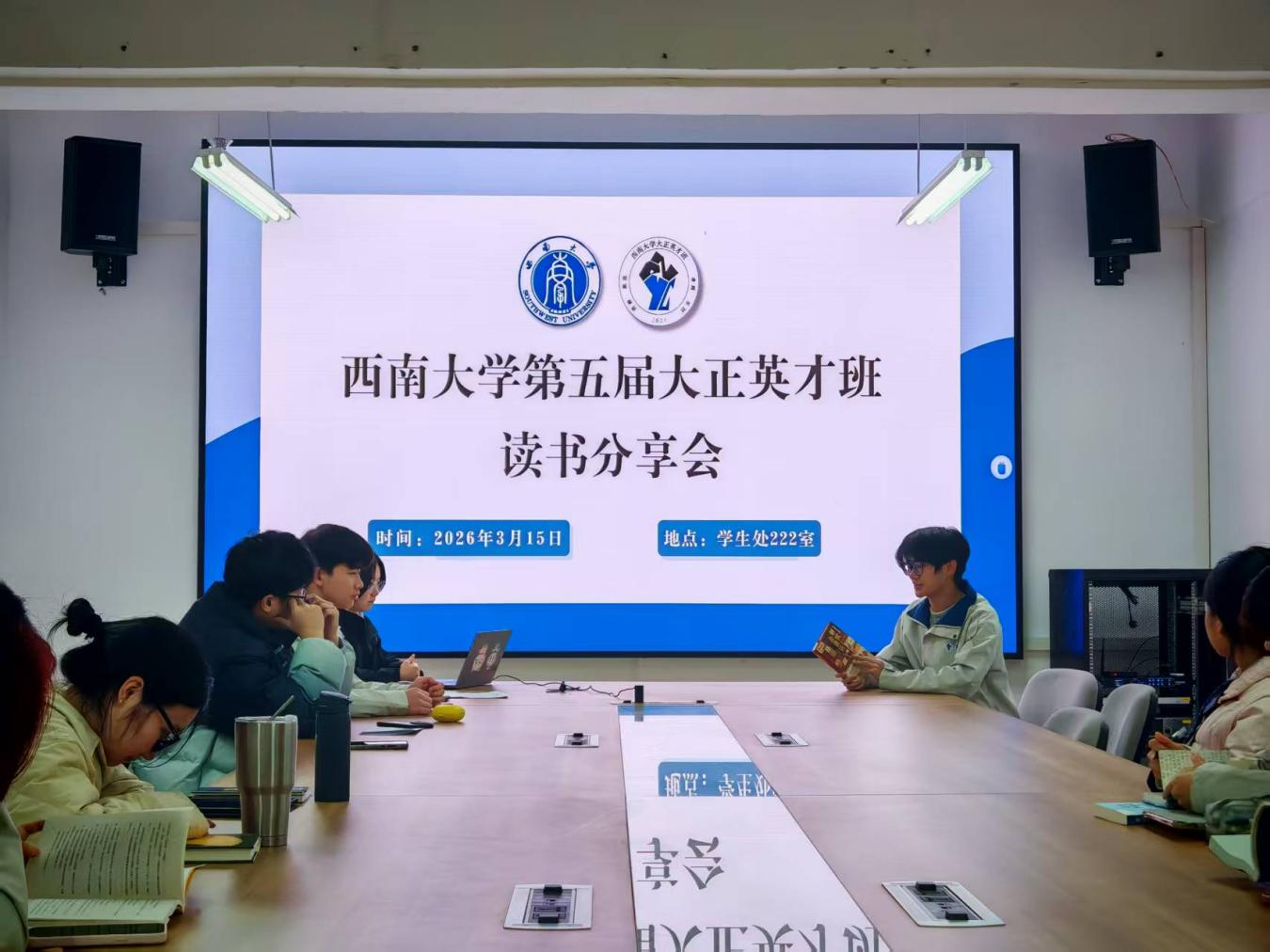 2026年3月15日,西南大学第五届大正英才班读书分享会在第二学生活动中心222会议室顺利举办。本次活动以“以书会友、以读增智”为核心,为大正英才班学员搭建沉浸式阅读交流平台,引导全体学员在书香浸润中涵养品格、增长才干。