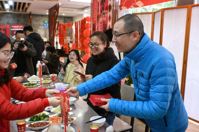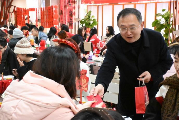 活动期间,黄杰等为寒假留校学生发放新春红包,送去新春祝福。整场活动气氛温馨、欢乐,充分展现学校学子团结奋进、积极向上的精神风貌。大家纷纷表示,活动丰富有趣,热气腾腾的饺子里充满浓浓的团圆味和思乡情,给寒假留校的时光带来了归属感和幸福感,注入了温暖和活力。