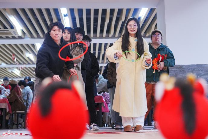 团拜会现场洋溢着喜庆祥和的节日氛围。同学们齐聚一堂,参加猜谜、套圈、投壶等趣味游戏,共同制作水饺、书写春联、互赠福字。同学们其乐融融,在游戏中体验传统民俗乐趣,在缕缕饺香中聊学业话家常,在墨香纸韵中寄托新年愿景。