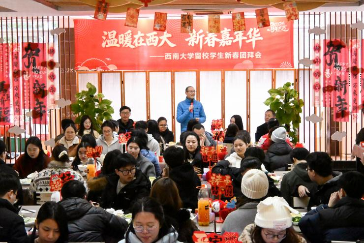 黄杰发表新春致辞。他代表学校党委和行政,向寒假留校学生致以节日问候和新春祝福,希望新春团拜会让每一位留校的学生感受到学校的亲切关怀与温暖,祝愿大家在新的一年里,龙马精神、万马奔腾、马到功成。